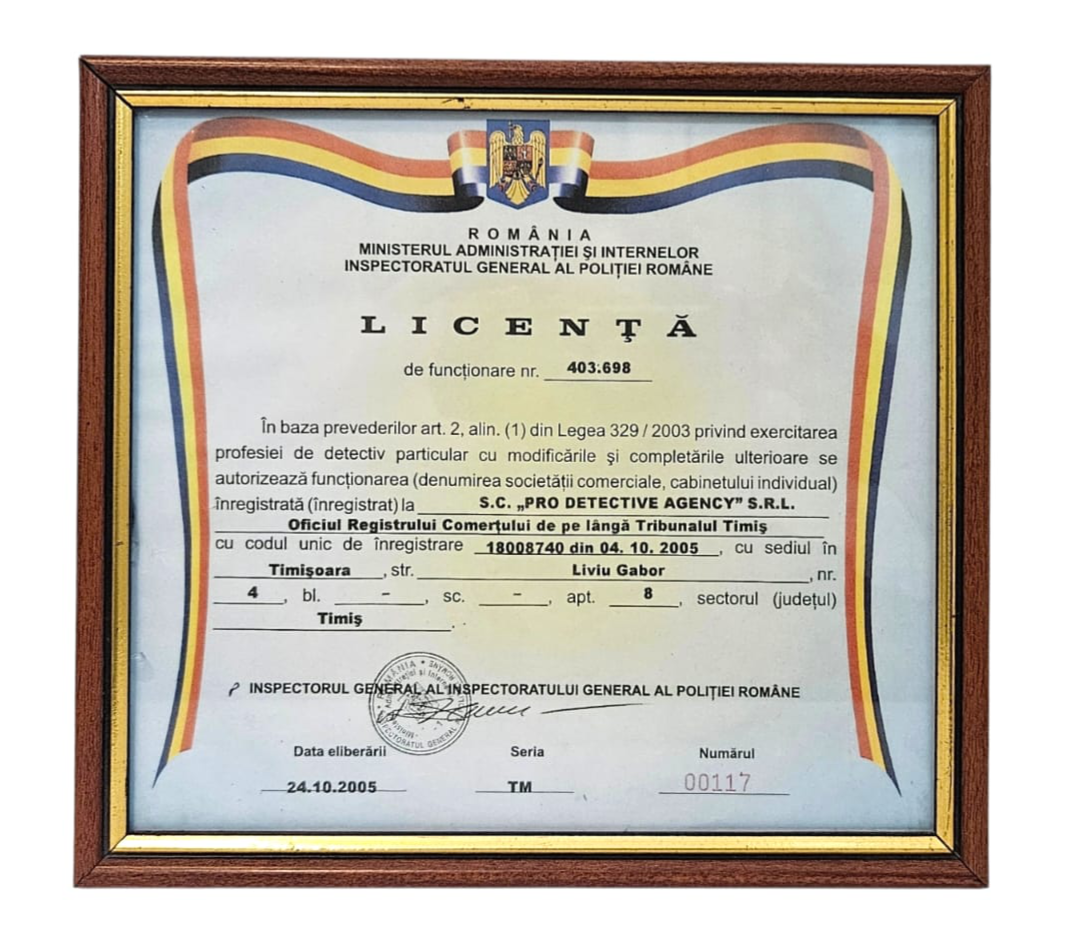 Agentia noastra de detectivi particulari are LICENTA DE FUNCTIONARE Nr. 403.698/2005.