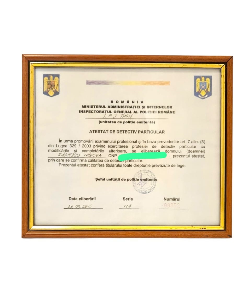 Detectivii nostri particulari sunt atestati profesional de Ministerul Administratiei si Internelor - Inspectoratul General al Politiei Romane.